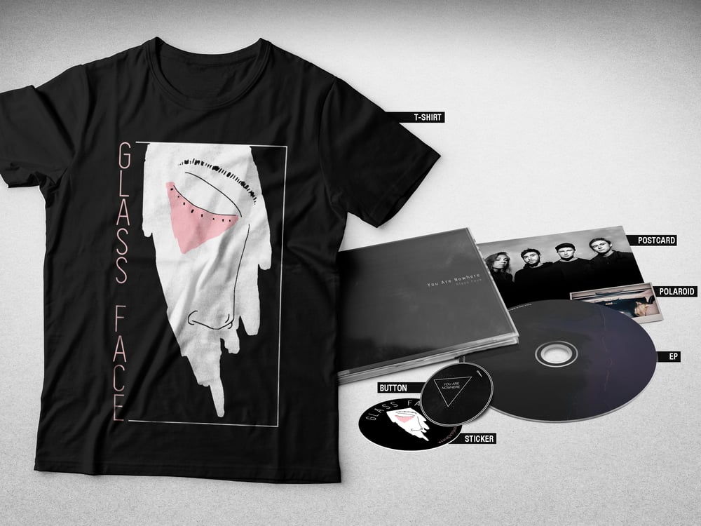 Purchase an American Apparel Glass Face shirt + a physical copy of the EP 'You Are Nowhere' in a digipak case with a booklet. The package also includes a postcard, sticker, button and a unique polaroid taken by the band.